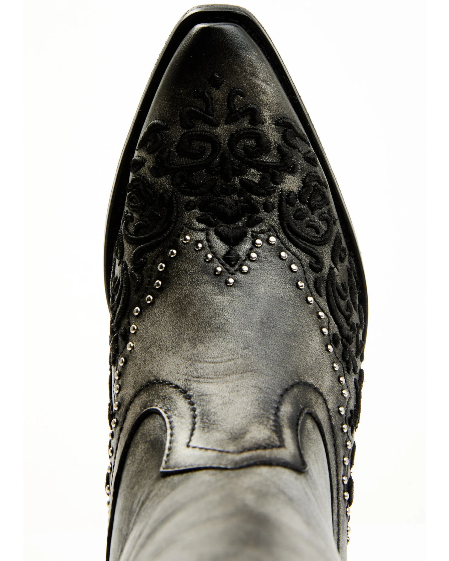- Embroidered floral trim shaft design with studded details on burnished leather