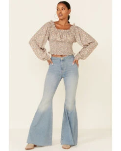 Beyond The Radar Women’s Ditsy Smocked Long Sleeve Peasant Crop TopĀ